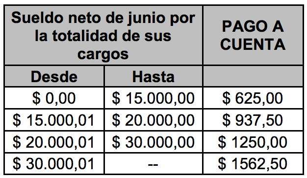 – pesos un mil doscientos cincuenta ($ 1.250) netos de aportes asistenciales y previsionales, para los agentes que a escala salarial de diciembre de 2017 hubieran percibido en el mes de abril de 2018, una remuneración por la totalidad de sus cargos, neta de aportes asistenciales y previsionales, inferior o igual a pesos quince mil ($ 15.000).